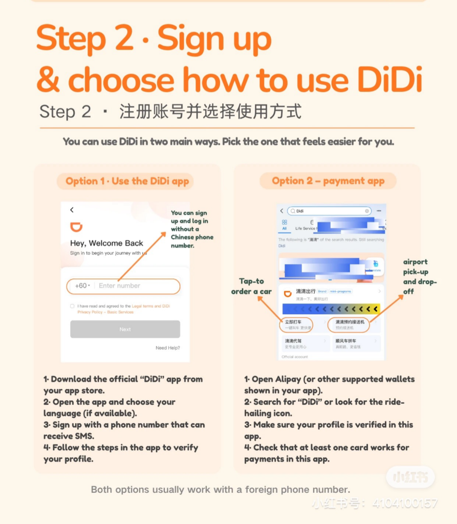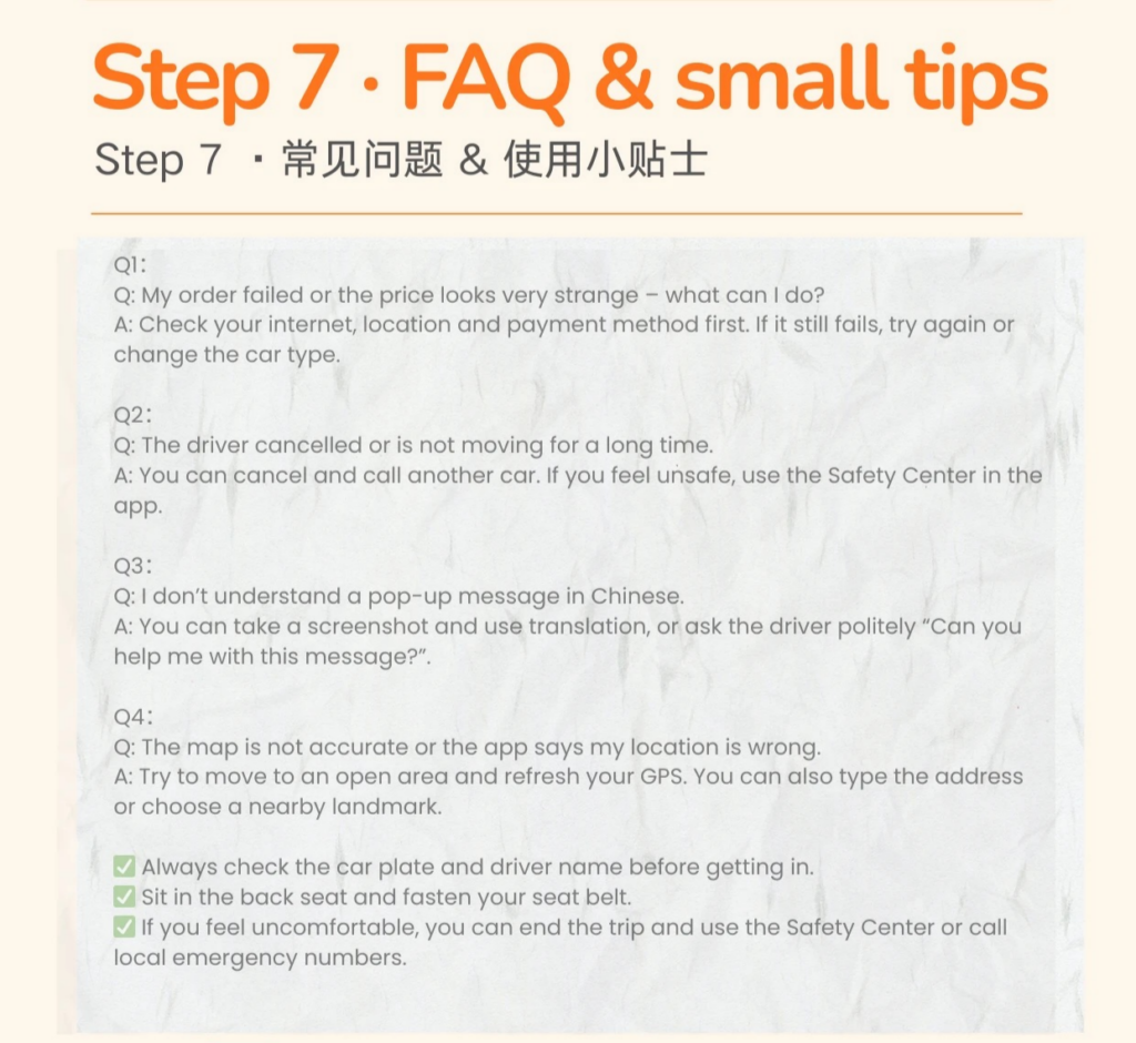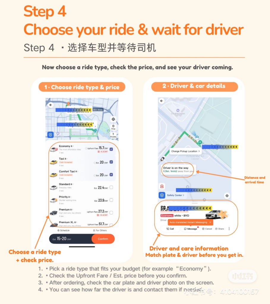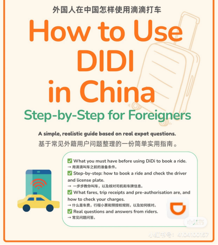 Recommended Platform: Didi, the most widely used and reliable ride-hailing application in China. Prepare printed or digital copies of destinations in simplified Chinese charactersto facilitate communication with local drivers (limited English proficiency).