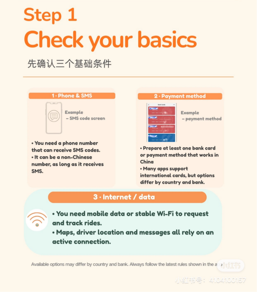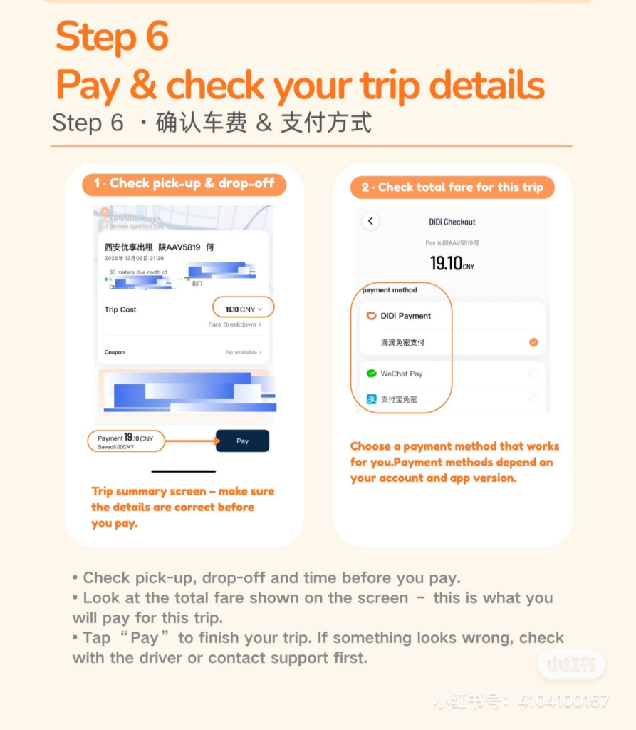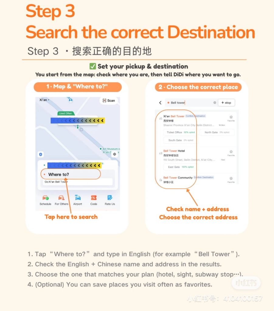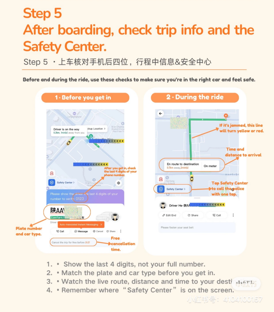 Recommended Platform: Didi, the most widely used and reliable ride-hailing application in China. Prepare printed or digital copies of destinations in simplified Chinese charactersto facilitate communication with local drivers (limited English proficiency).